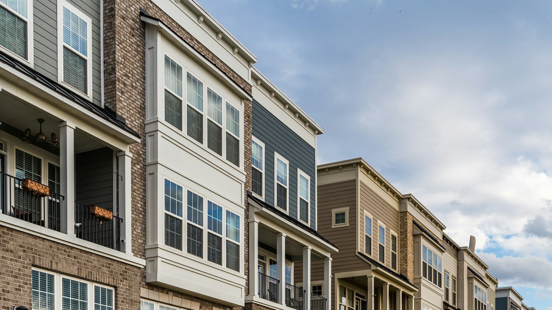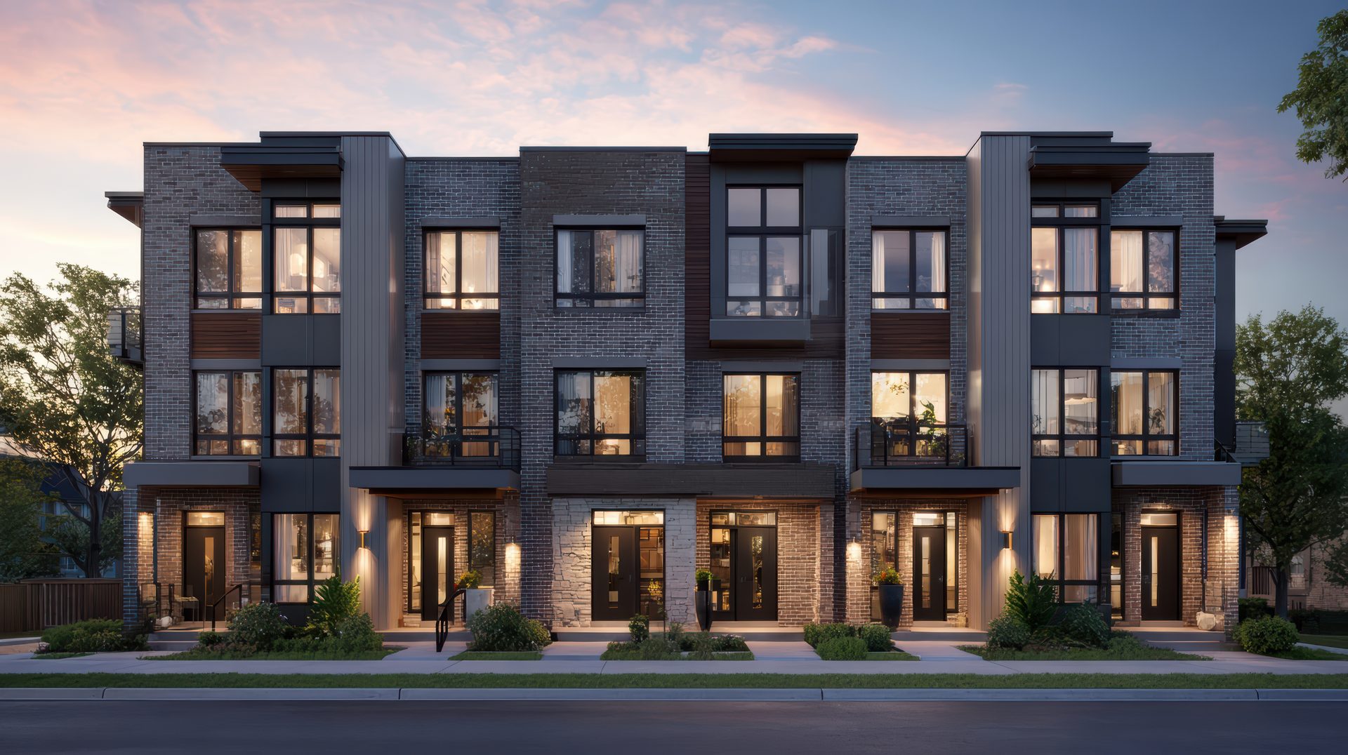 A 100-unit townhome development across 15 buildings in Livonia, Michigan. Each unit features a private garage and balcony, complemented by a community park with a walking path.